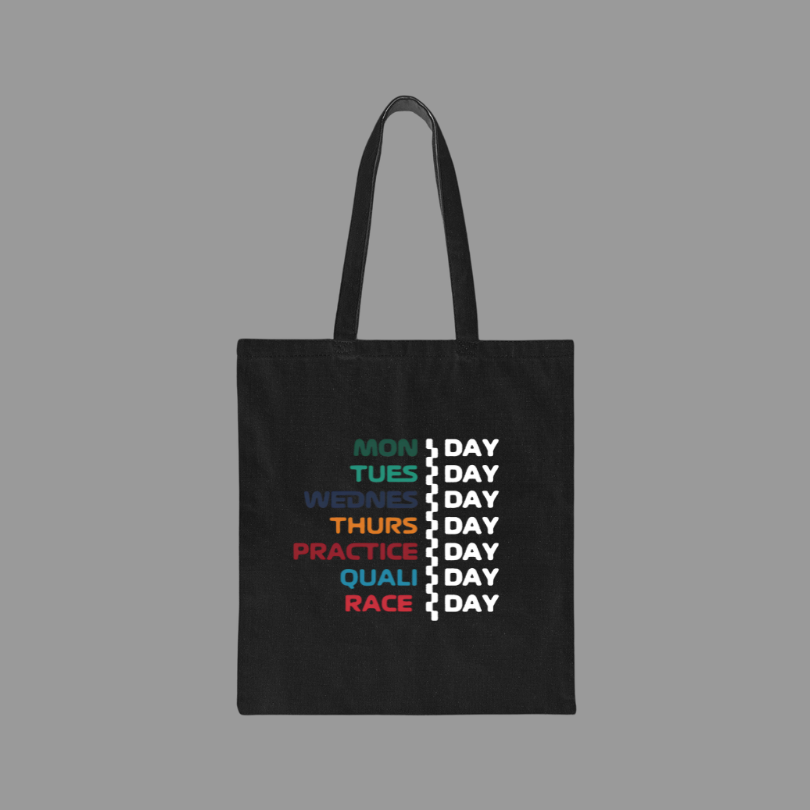 Our bestselling Race Week Schedule Tote Bag from Custom Apparels is a must-have for every motorsport fan. Featuring a bold, colorful race week graphic, it highlights every day from Monday to Race Day.
