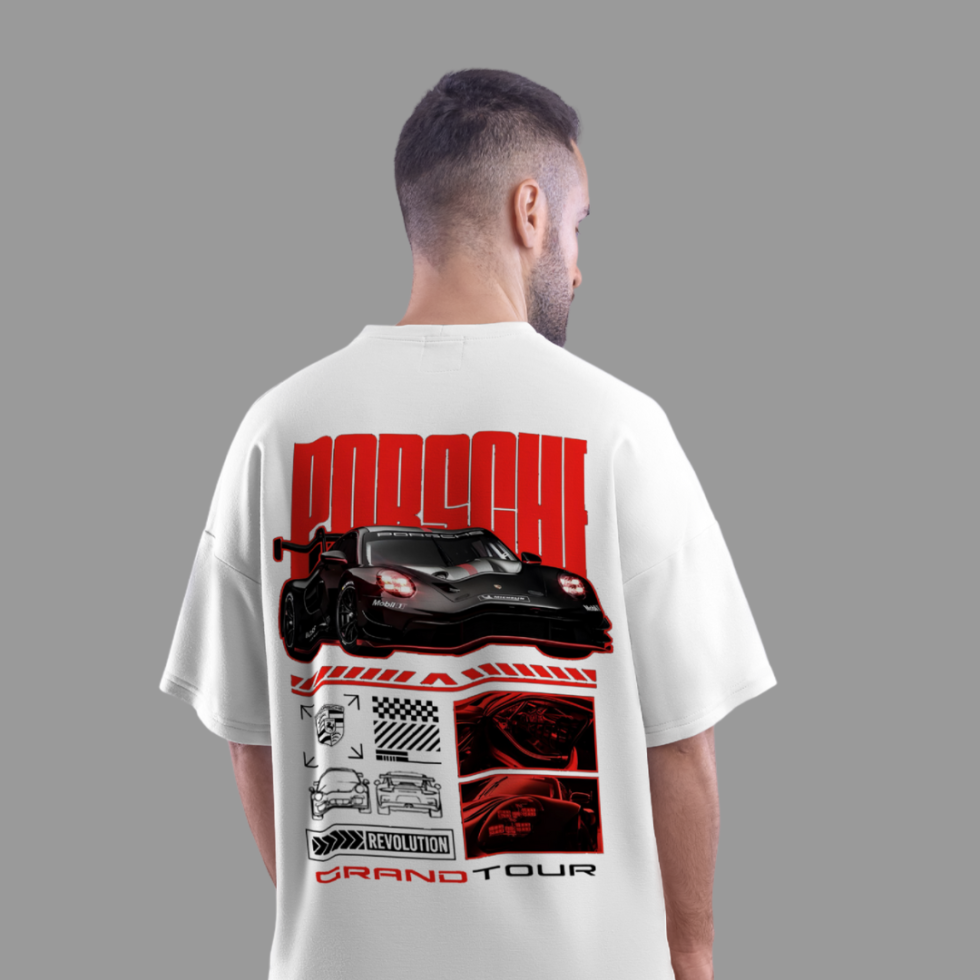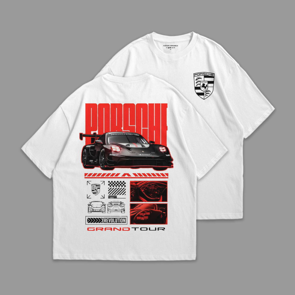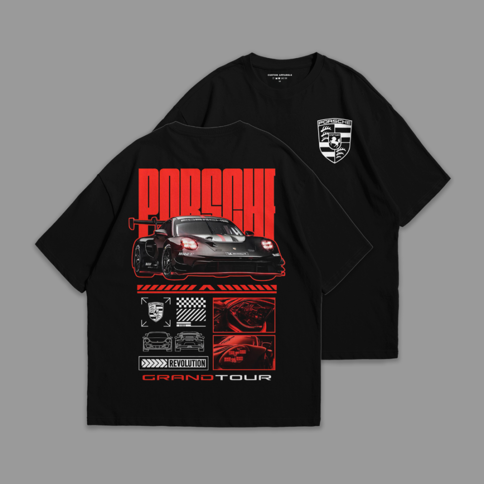 Unleash your inner racer with the Porsche Grand Tour Oversized Tee by Custom Apparels. Featuring a bold Porsche GT race car graphic with vintage racing details and red accents, it’s perfect for speed lovers and streetwear fans.