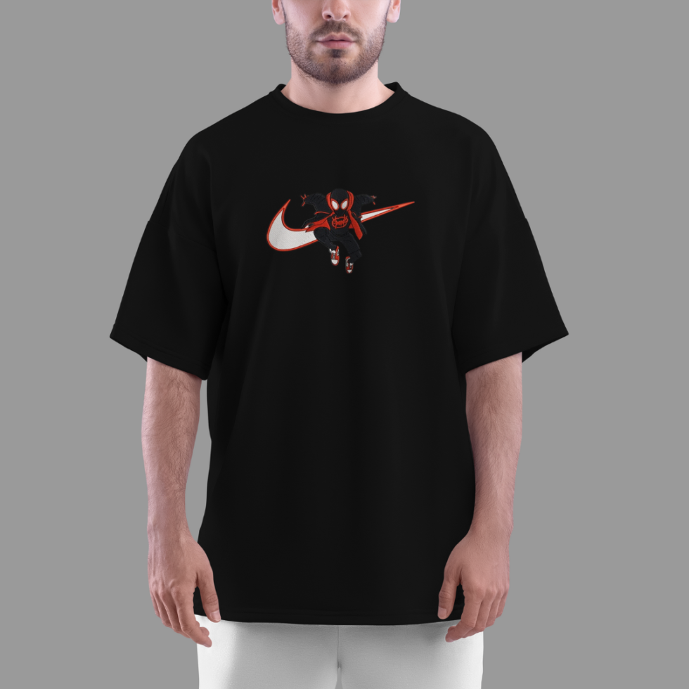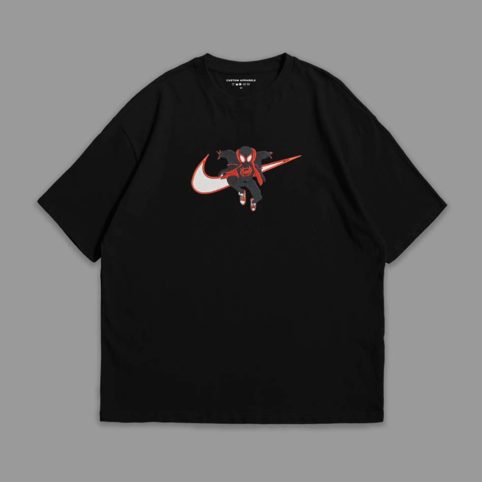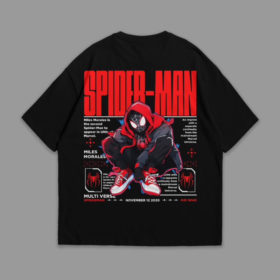 Step into the Spider-Verse with our Spider-verse Oversized Tee, inspired by the fearless energy of Miles Morales. Featuring bold, high-contrast graphics of Miles crouched in his iconic red-and-black suit on the back, and a clean, street-style swoosh leap on the front — this tee blends comic-book flair with urban culture.